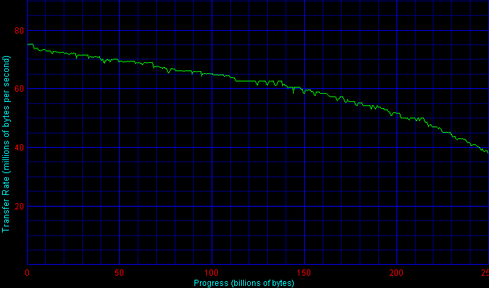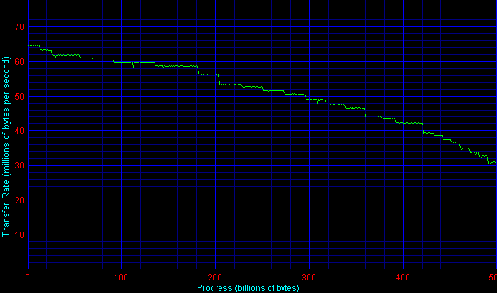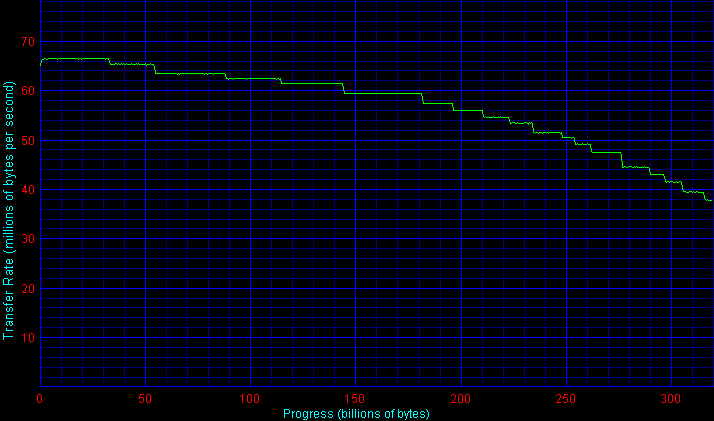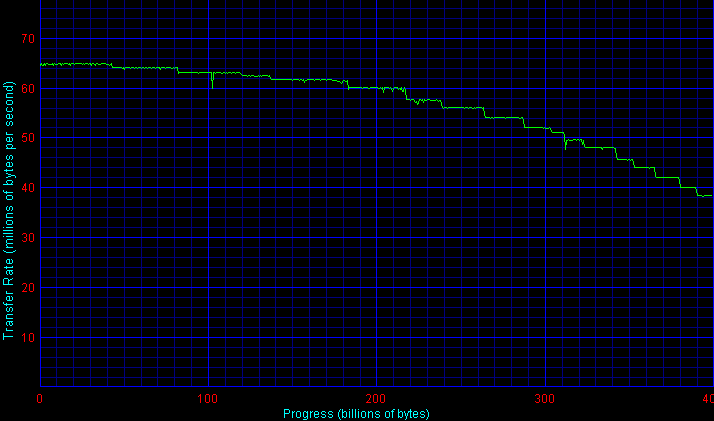 Как нетрудно заметить, графики скорости линейного чтения для дисков WD4000YR и WD4000KD одинаковы, что несложно было предвидеть. ;) Если сравнивать их с графиками для моделей WD3200JD и WD2500KS на 100-гигабайтных пластинах, то окажется, что 400-ка чуть быстрее в среднем, чем 250-ка (при равенстве на внешних дорожках, но ином зонном разбиении) и немного медленнее, чем 320-ка, пластины которой отформатированы на 107 Гбайт. Это подтверждает и диаграмма: