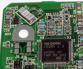Заметим, что в данном случае WD применила двухчиповый дизайн (вместо более традиционного нынче одночипового). Когда за интерфейс Serial ATA и обмен с кэш-памятью отвечает контроллер WD70C42 самой WD, а обслуживанием головок занимается микросхема Marvell 88C6590 (в остальных современных дисках WD меньшей емкости за все эти функции отвечает всего один компактный чип Marvell 88i6545, хотя года два назад WD также применяла двухчиповое «сердце» контроллера в дисках WD2500JD, основанное на паре микроконтроллеров WD70C26 и Marvell, см. наш обзор). Разумеется, это вынужденная мера, связанная с необходимостью работать с возросшим до восьми количеством головок и обслуживанием четырех пластин. Последней причиной, отчасти, вызвана и замена драйвера электромеханики новой микросхемой Smooth L6284 вместо использующейся в менее емких моделях WD микросхемы Smooth L6283.