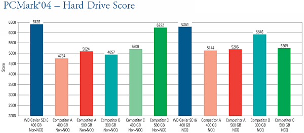 Впрочем, мы оттестировали WD4000KD в двух режимах — с NCQ и без NCQ, чтобы понять, в чем может «собака порыться». :) Напомню кратко, что суть «проблемы NCQ» в дисках WD (то есть почему компания стала поставлять большинство своих настольных дисков с отключенной NCQ, хотя номинально диски вполне способны NCQ поддерживать) заключается в том (и об этом WD прилюдно говорит в своей презентации для WD4000KD), что, например, модель WD4000KD при включении NCQ демонстрирует заметно худшую производительность в ряде «настольных» приложений и тестов, чем без NCQ: