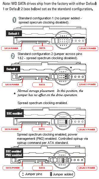 Таким образом, 3 Гбит/с в этих двух дисках WD искать не стоит. :) Зато эта скорость интерфейса появляется во всех остальных жестких дисках серий Caviar SE16 и Caviar RE2 (см. таблицу 1). И уже в тех дисках появляется наклейка на корпусе, как можно переключить скорость интерфейса между 1,5 и 3 Гбит/с. Для WD4000KD и WD4000YR джамперами на интерфейсном торце корпуса можно менять только SSC (размывание частотного спектра) и PM2 (управление электропитанием):