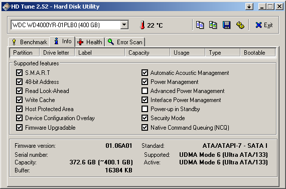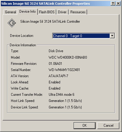 Еще одно сомнение может поджидать пользователя WD4000KD, когда он попытается определить тип интерфейса, которым этот диск оснащен. Некоторые продавцы в прайс-листах, а также некоторые диагностические утилиты (см., например, предыдущий скриншот, причем, в отличие от такого же скриншота для WD4000YR!) информируют о поддержке Serial ATA II, хотя и производитель в спецификациях, и драйверы контроллеров SATA II, к которым этот диск подключен, четко докладывают о поддержке накопителем лишь первого поколения скорости Serial ATA в 1,5 Гбит/с.