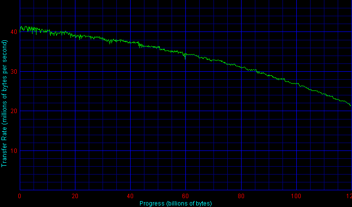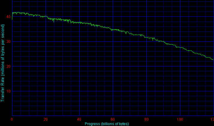 И здесь скорость в начале диска местами даже превышает 50 Мбайт/с.