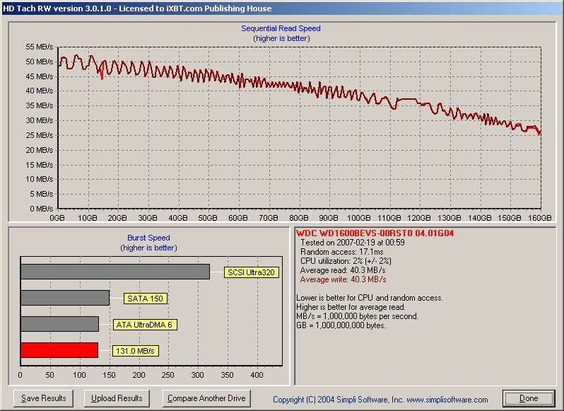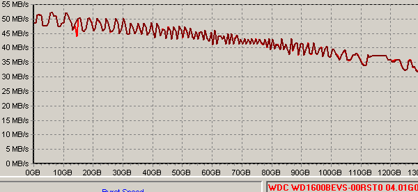 К слову, графики скорости линейного чтения и линейной записи, снятые, например, в программе HD Tach 3.0.1.0 для WD1600BEVS практически идентичны (см. скриншот: чтение красным, запись бордовым).