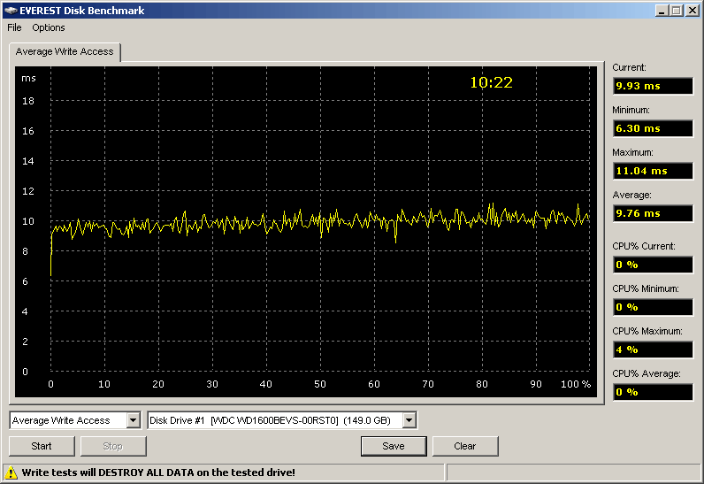 Интересную особенность мы подметили и для изменения среднего времени доступа при записи для WD1600BEVS по мере «прогрева» накопителя. 10-минутный тест в программе Everest показывает, что со временем данный параметр может немного возрастать: