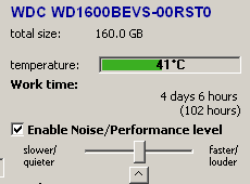 Управление акустикой поиска у этих дисков поддерживается, значение по--умолчанию — быстрый поиск (AAM disabled), хотя при этом он все же весьма тих и почти неразличим на фоне шума вращения пластин. При помощи обычных утилит для изменения статуса регистра AAM диск можно перевести в режим тихого поиска (скриншот программы HDD Life):