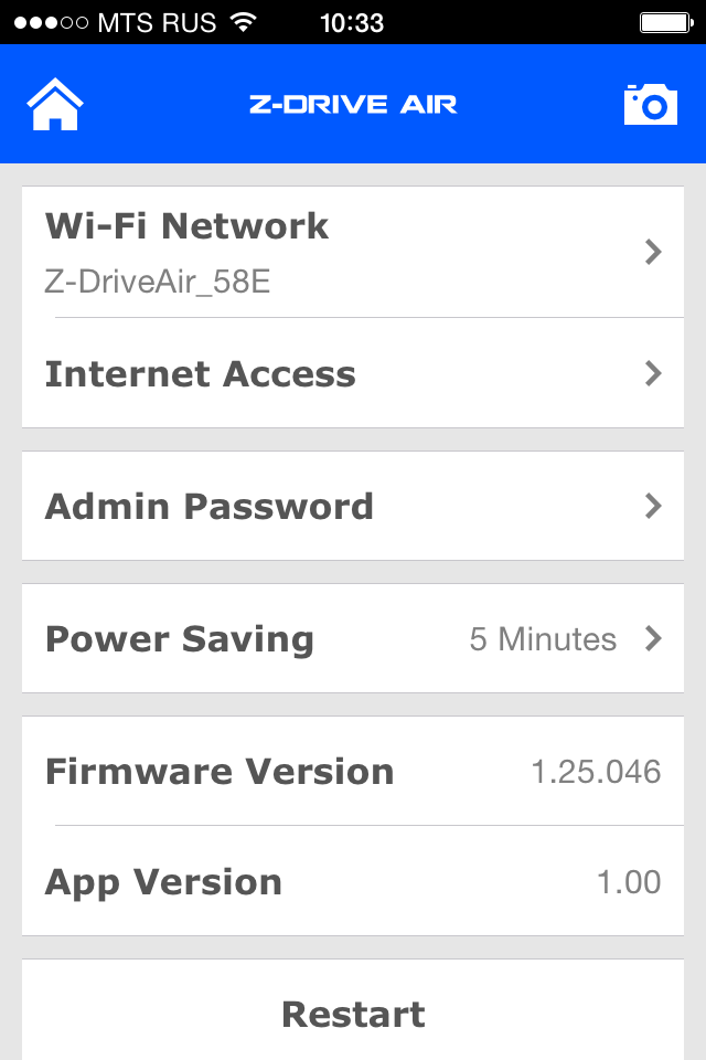 Устройства с iOS способны работать только с указанными в таблице форматами мультимедиа. Даже если закачать файл на смартфон или планшет, открыть его в другой программе не получится, такой возможности просто не предусмотрено в Z-Drive Air. Так что для неподдерживаемых форматов остается только вариант работы с DLNA-клиентом. Что касается работы с камерой, то для iOS также заявлена возможность делать фотографии и снимать видео с загрузкой на накопитель. С тестовым смартфоном под управлением последней версии iOS эта функция не работала (программа «вылетала»). Но загрузить фотографии и видео из фотогалереи на диск получилось.