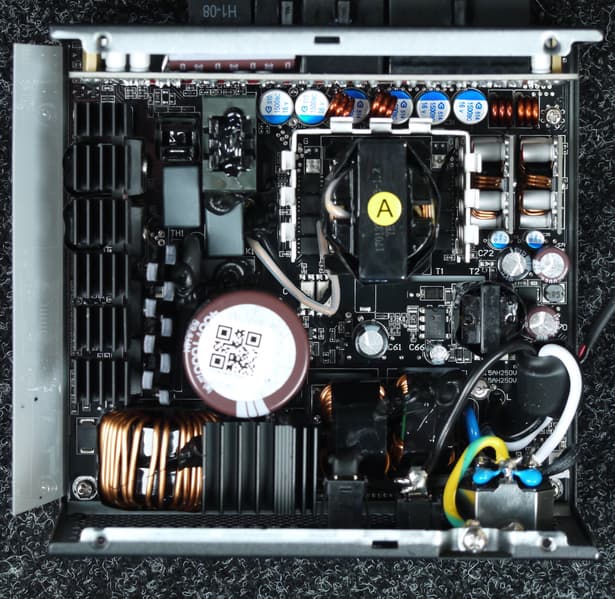 Конструкция блока питания вполне соответствует современным тенденциям: активный корректор коэффициента мощности, синхронный выпрямитель для канала +12VDC, независимые импульсные преобразователи постоянного тока для линий +3.3VDC и +5VDC.