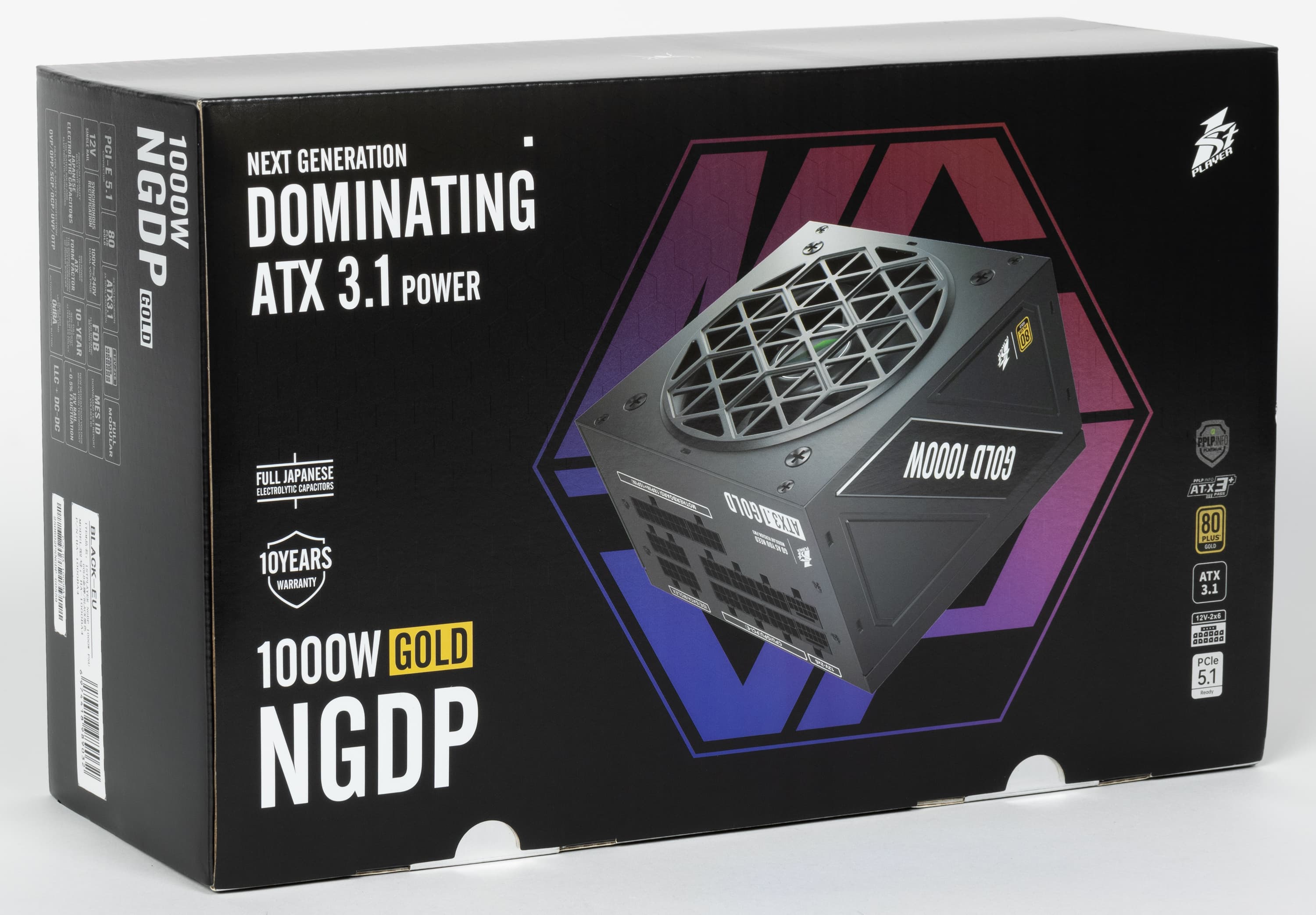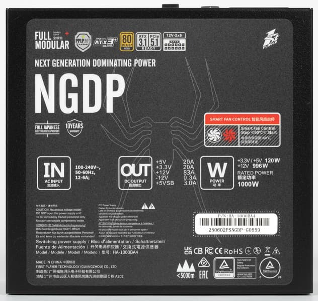 В этот раз мы познакомимся с блоком питания 1stPlayer NGDP мощностью 1000 Вт, который имеет сертификат 80Plus Gold. Блок питания соответствует стандарту ATX 3.1 и позволяет питать очень мощные современные видеокарты через 16-контактный разъем PCIe 5.1 (12V-2×6). Причем разъемов на корпусе два, а шнур в комплекте всего один.