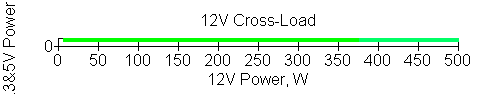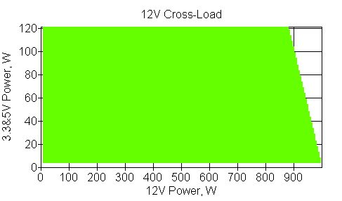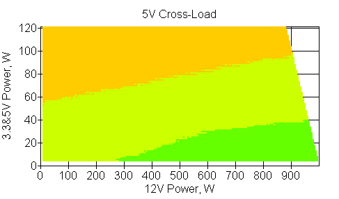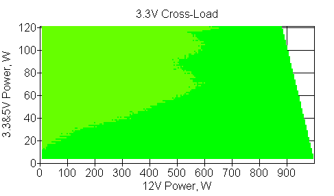 Следующим этапом инструментального тестирования является построение кросснагрузочной характеристики (КНХ) и представление ее на четвертьплоскости, ограниченной максимальной мощностью по шине 3,3&5 В с одной стороны (по оси ординат) и максимальной мощностью по шине 12 В с другой (по оси абсцисс). В каждой точке измеренное значение напряжения обозначается цветовым маркером в зависимости от отклонения от номинального значения.