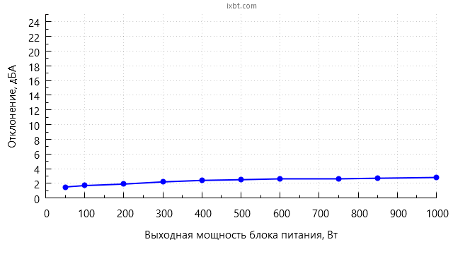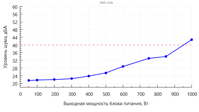 В диапазоне мощности до 400 Вт включительно шум блока питания находится на минимально заметном уровне для жилого помещения в дневное время суток (25 дБА и менее).