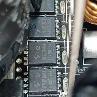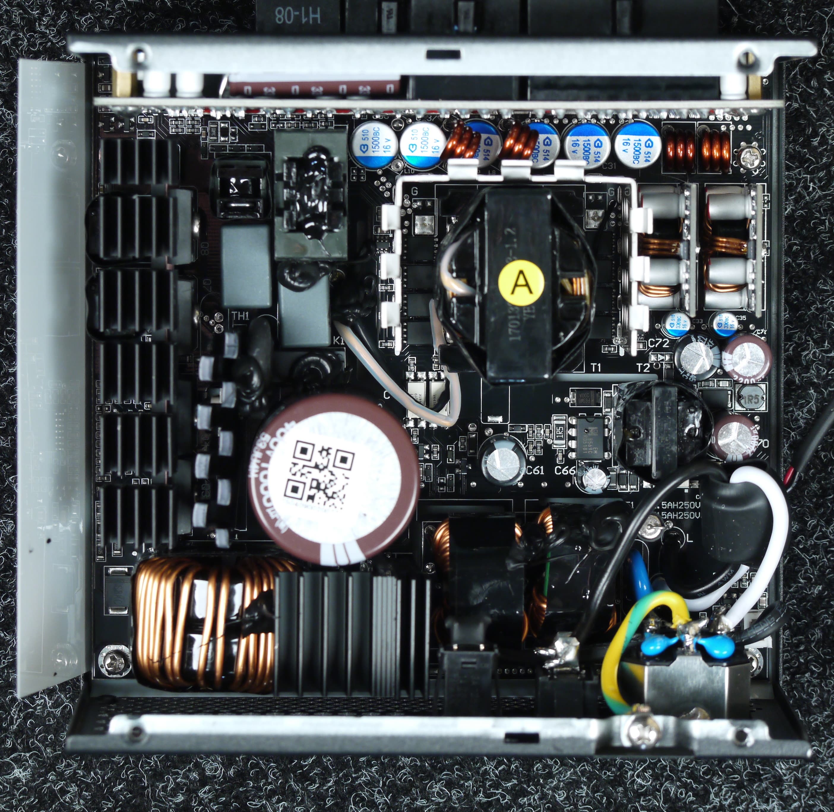 Высоковольтные силовые элементы установлены на нескольких радиаторах разных размеров, транзисторы синхронного выпрямителя установлены с лицевой стороны основной печатной платы, на них нет радиаторов, но вокруг места установки есть теплорассеивающие элементы.