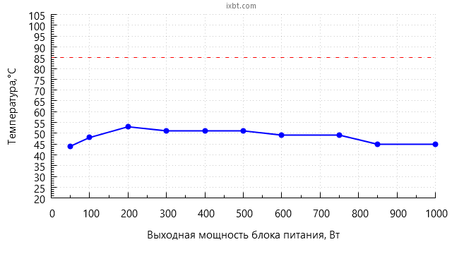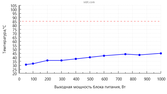 Также стоит учитывать, что в случае работы с остановленным вентилятором температура компонентов внутри БП сильно зависит от окружающей температуры воздуха, и если та установится на уровне 40-45 °C, это приведет к более раннему включению вентилятора.