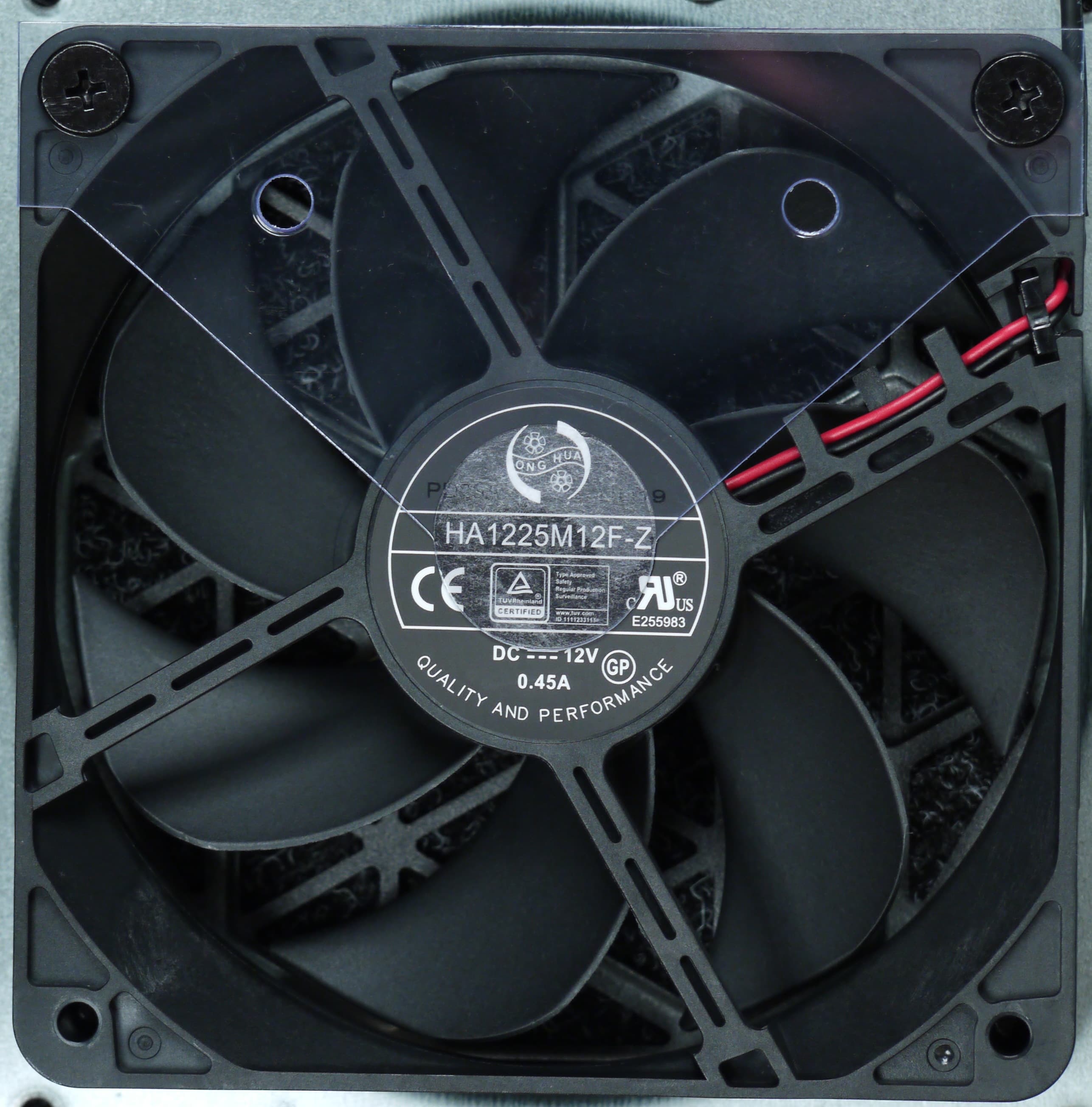 В блоке питания установлен вентилятор Honghua HA1225M12F-Z типоразмера 120 мм (2050 об/мин), подключение двухпроводное, через разъем. Вентилятор основан на гидродинамическом подшипнике, что подразумевает долгий срок его службы.