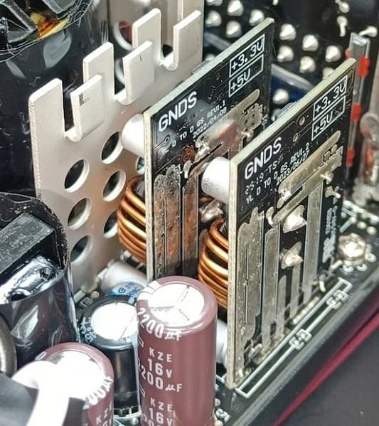 Элементы импульсных преобразователей каналов +3.3VDC и +5VDC размещены на дочерних печатных платах, установленных вертикально.