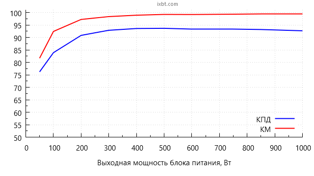 Всего таким образом мы измерили параметры блока питания в 10 точках. В результате максимальный КПД в нашем случае составил 93,7% при выходной мощности 500 Вт. Максимальная рассеиваемая мощность составила 79 Вт при работе на нагрузку 1000 Вт, что является отличным показателем для блока питания подобной мощности.