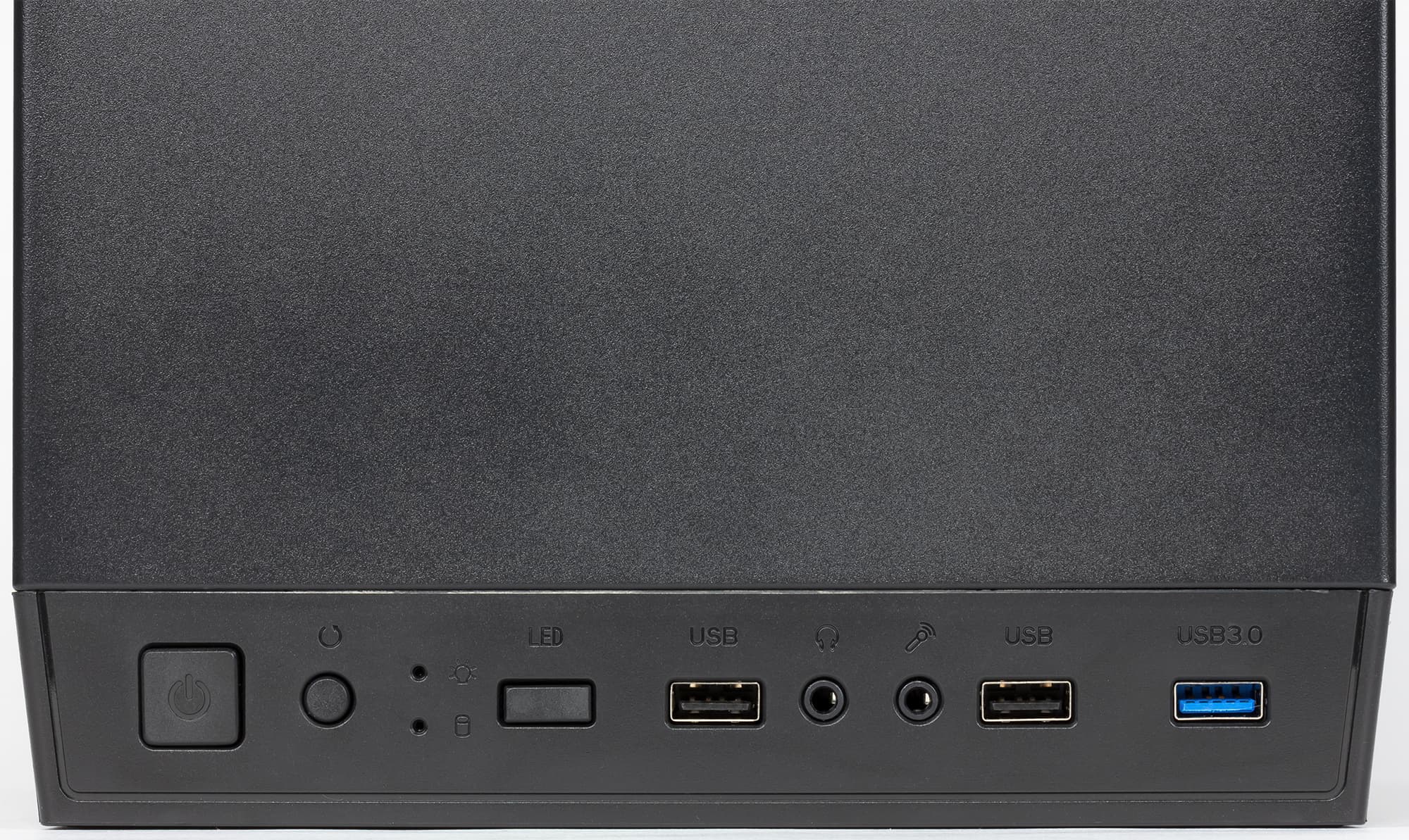 В верхней части передней панели размещены органы управления и коммутации. В их состав входят два порта USB 2.0 и один USB 3.0, стандартные разъемы для подключения микрофона и наушников, большая кнопка включения и круглая кнопка перезагрузки. Тут же расположена кнопка управления подсветкой, хотя подсветки корпус лишен.