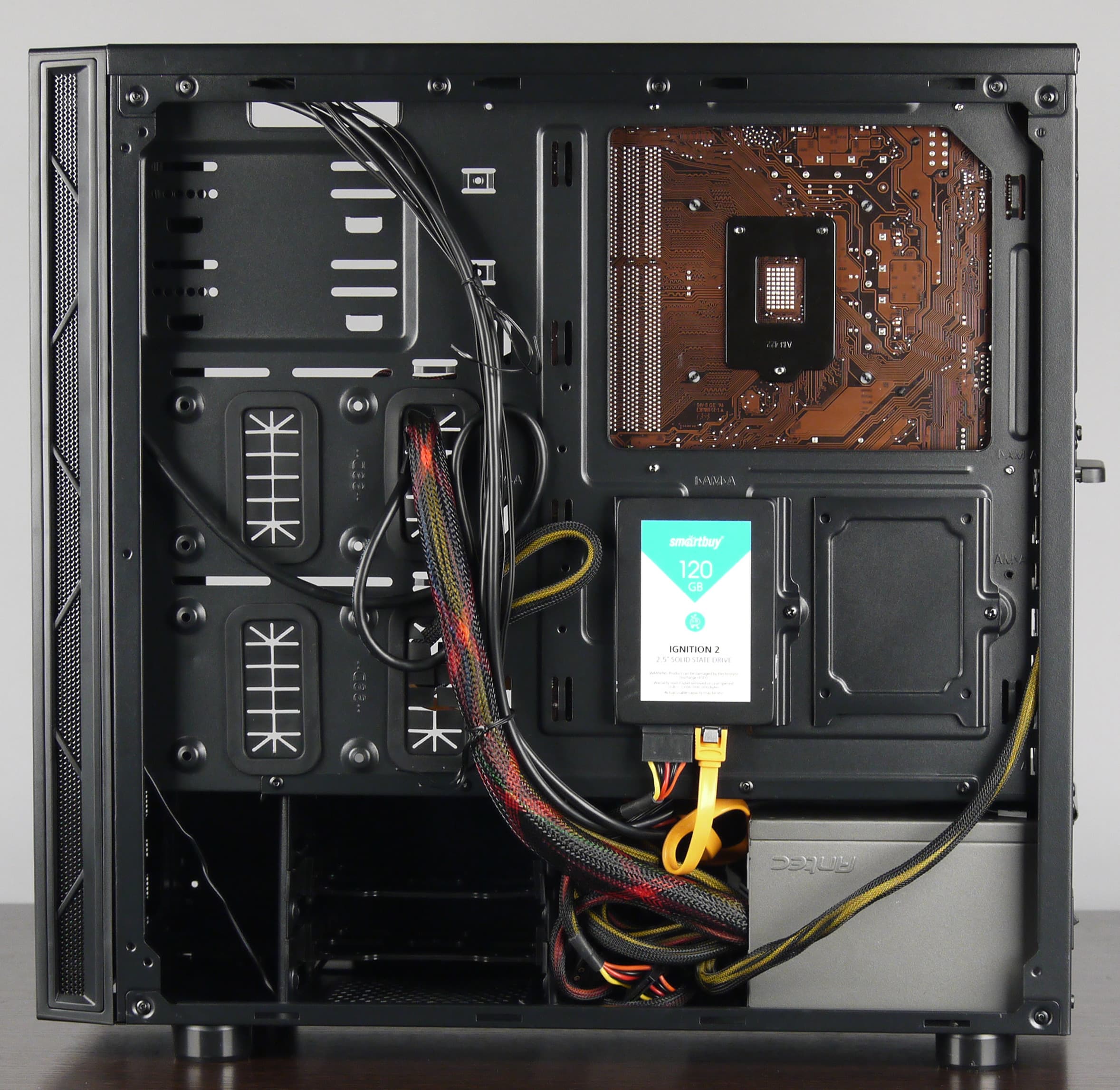 Всего тут можно установить шесть накопителей формата 2,5″ или 2×3,5″ и 4×2,5″. Этого вполне достаточно для типичного домашнего компьютера невысокой ценовой категории.