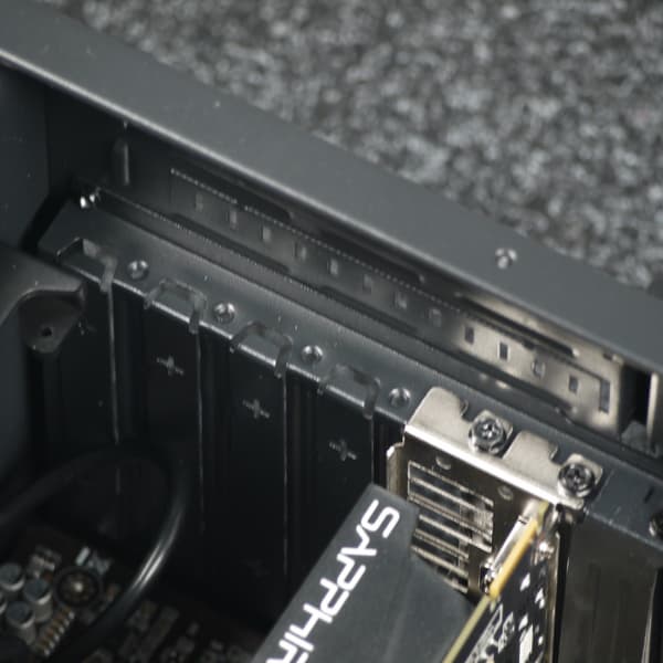Далее можно установить требуемые платы расширения, например видеокарту, которая может достигать в длину около 39 см, если объем корпуса между системной платой и передней стенкой шасси ничем не занят. Система фиксации карт расширения самая обычная: крепление на винтах изнутри корпуса с индивидуальной фиксацией винтом. Заглушки одноразовые, кроме самой первой (для видеокарты).