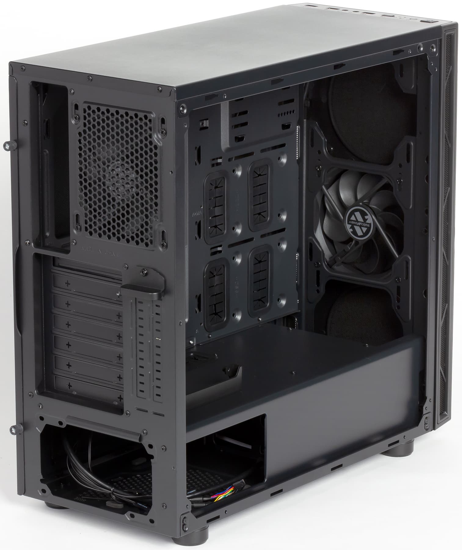 Корпус вполне пригоден для сборки недорогого компьютера широкого функционального назначения, офисный компьютер на его базе собрать также можно. Как часто бывает, не обошлось без экономии на спичках: один из двух штатных вентиляторов не поддерживает управление скоростью вращения. Дополнительная экономия достигается за счет толщины стальных элементов.