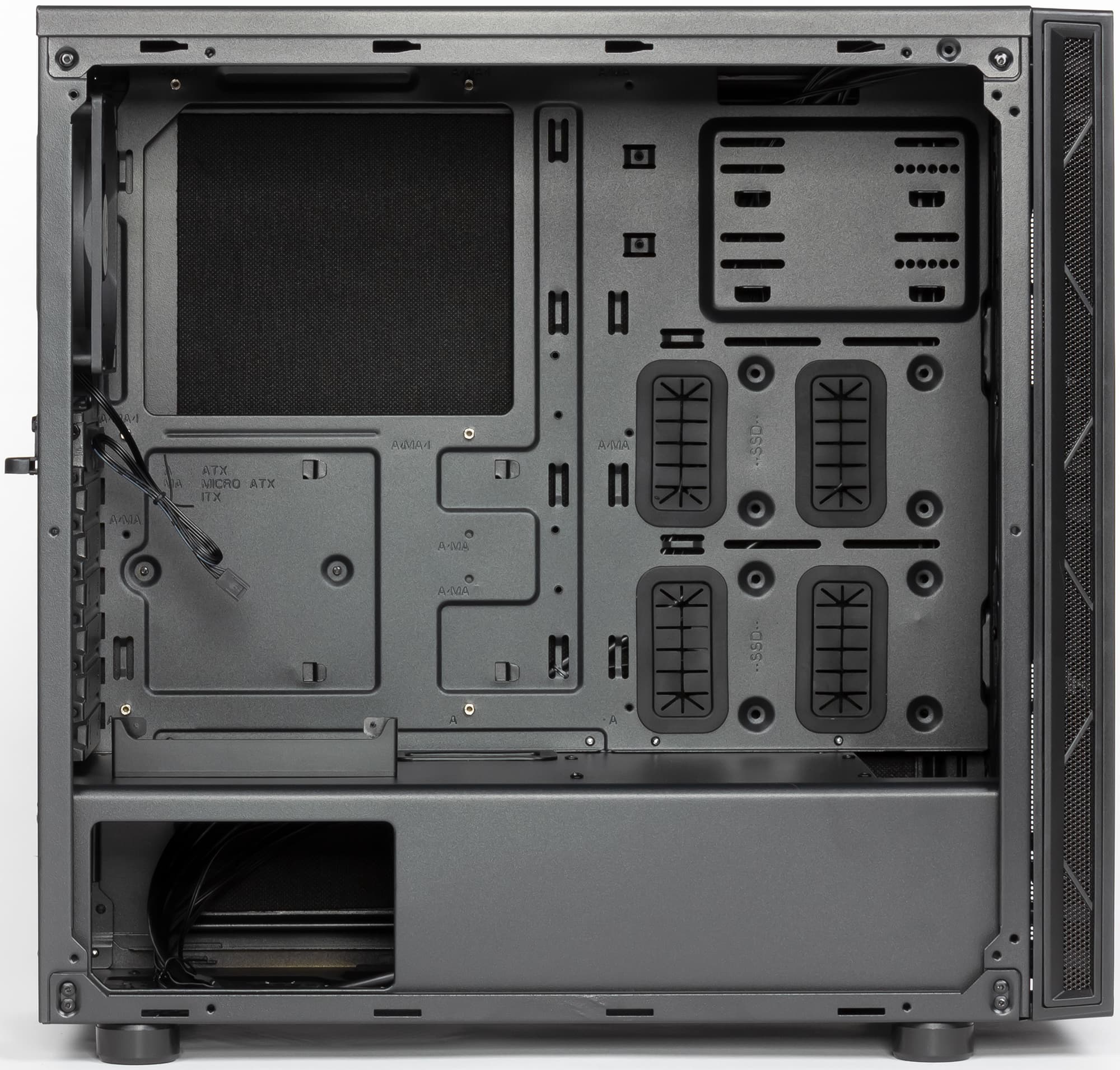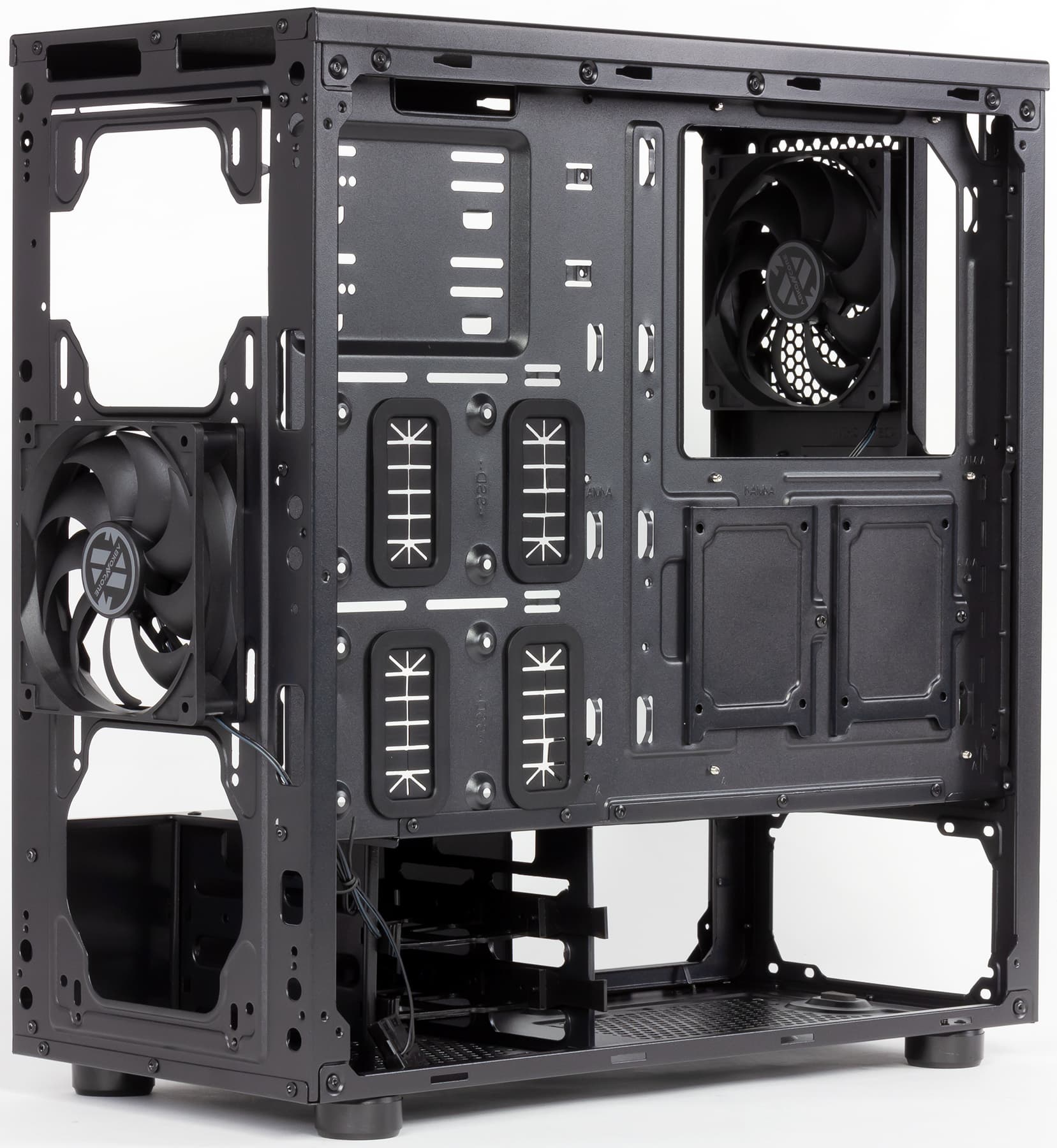 В корпусе предусмотрена возможность установки до четырех вентиляторов типоразмера 120 и 140 мм. Посадочные места для них имеются спереди и сзади.