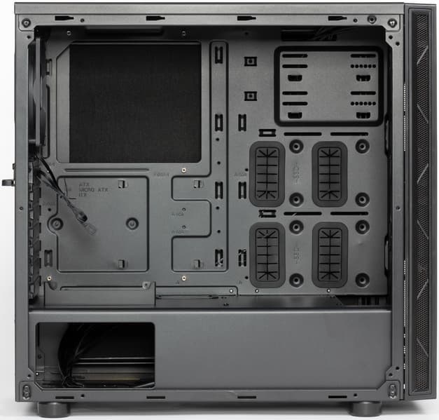 Компоновочные решения данной модели определяются современными тенденциями корпусостроения. В данном случае разработчики отказались от отсека для устройств формата 5,25″, а привычный отсек для устройств 3,5″ расположен под кожухом БП около передней стенки шасси, но присутствует он в усеченном виде — всего на два диска.