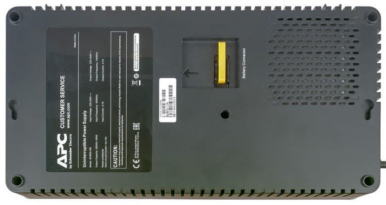 Снизу имеется и стандартная для подобных устройств APC перемычка желтого цвета, при транспортировке или во время длительного хранения размыкающая цепь батареи.