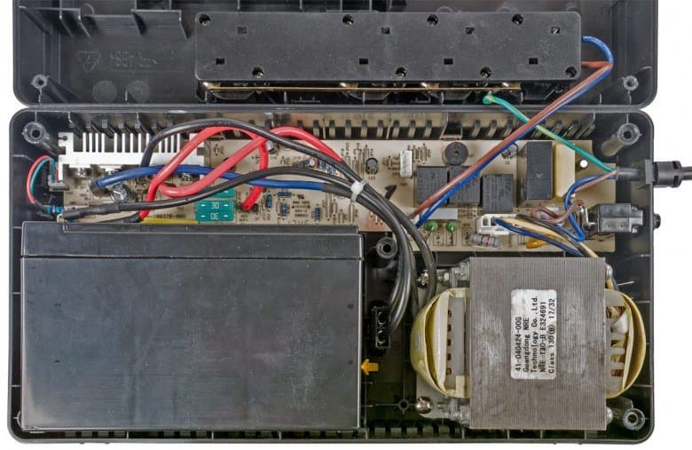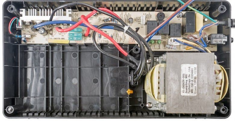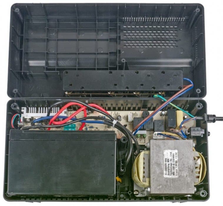 Долго описывать внутреннее устройство Easy-UPS BV800i не приходится: одна плата с электронными компонентами, трансформатор и батарея — о ней скажем немного подробнее, но чуть позже.