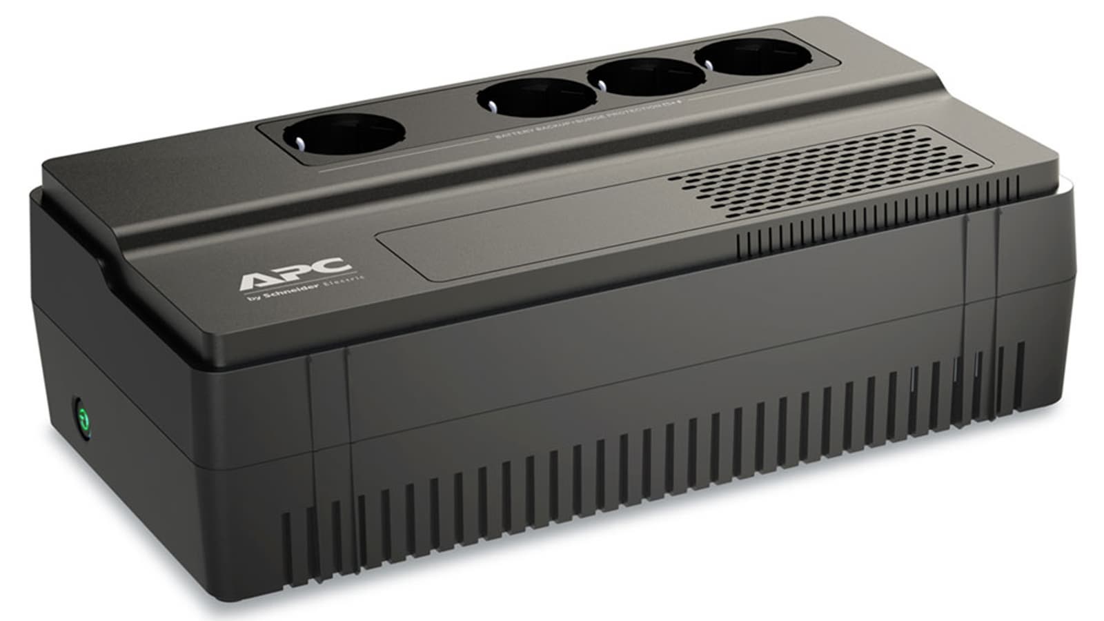 Нам достался ИБП APC Easy-UPS BV800i с четырьмя выходными розетками Schuko (такие модификации имеют буквы «GR» в индексе) и входным кабелем, выходящим из корпуса без разъема (иного для моделей с такими розетками не предлагается).