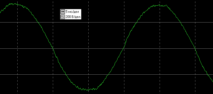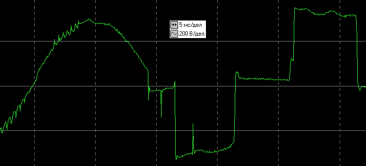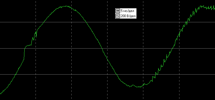 При работе от батареи на выходе инвертора, как и следовало ожидать, типичная для подобных источников «аппроксимированная синусоида», с математической синусоидой ничего общего не имеющая, но вполне пригодная для работы с нагрузками, оснащенными импульсными блоками питания.