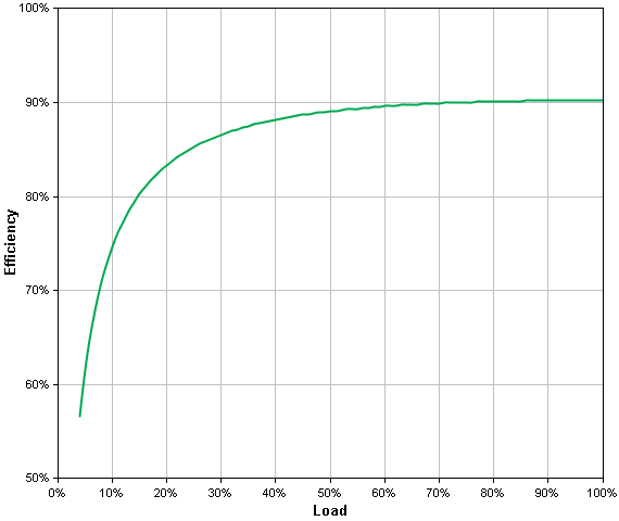 В обзорах ИБП мы отмечали, что КПД источников (точнее, их инверторов) зависит от нагрузки. Для SRV2KI на официальном ресурсе есть подтверждающий это график: