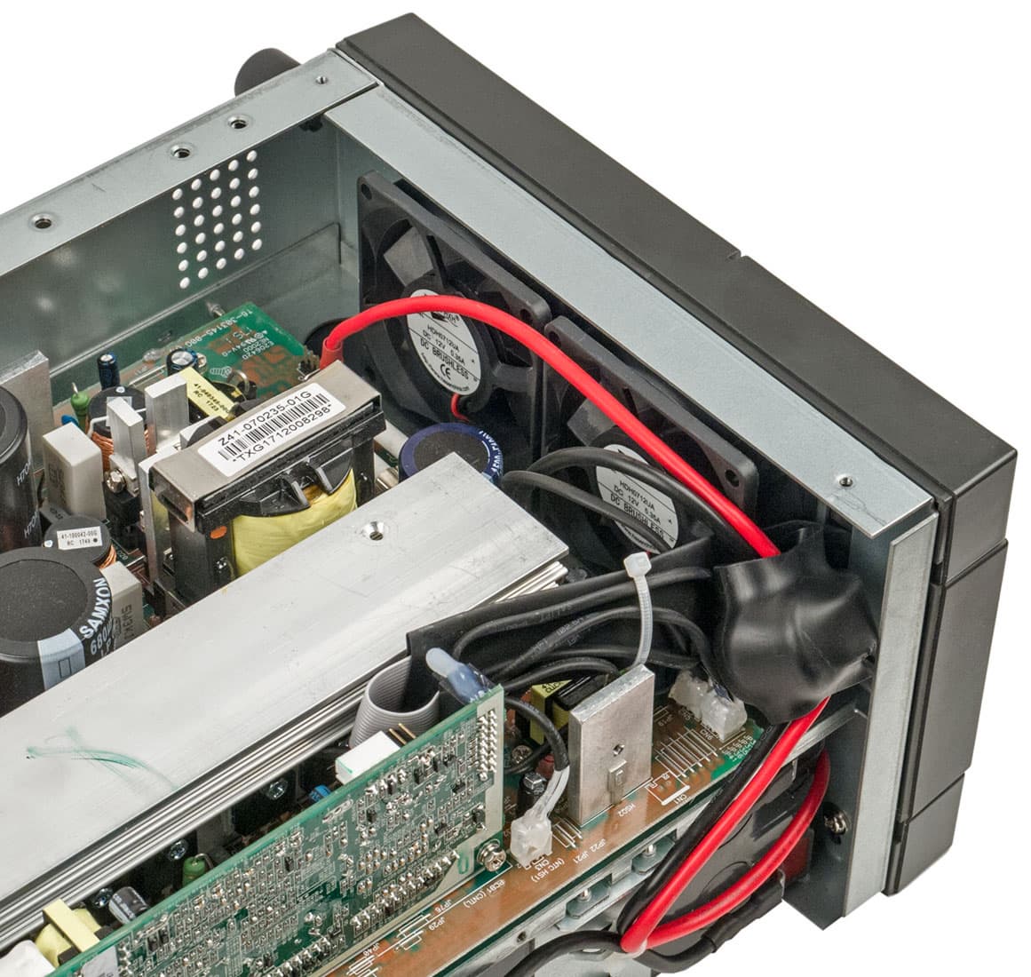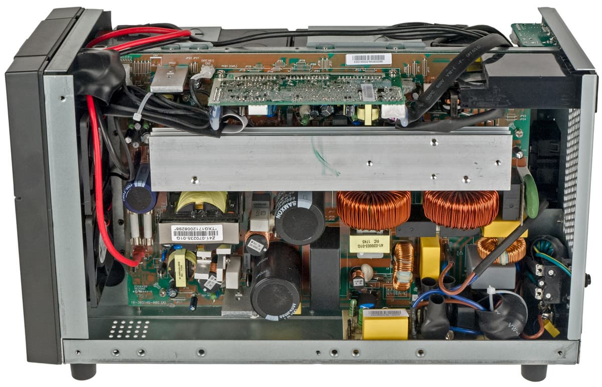 На самой большой плате расположены инвертор и цепи управления. Силовые компоненты — транзисторы, диоды и выпрямительный мост — установлены на общем алюминиевом радиаторе, ребра которого ориентированы продольно, что соответствует направлению потока воздуха, создаваемого вентиляторами.
