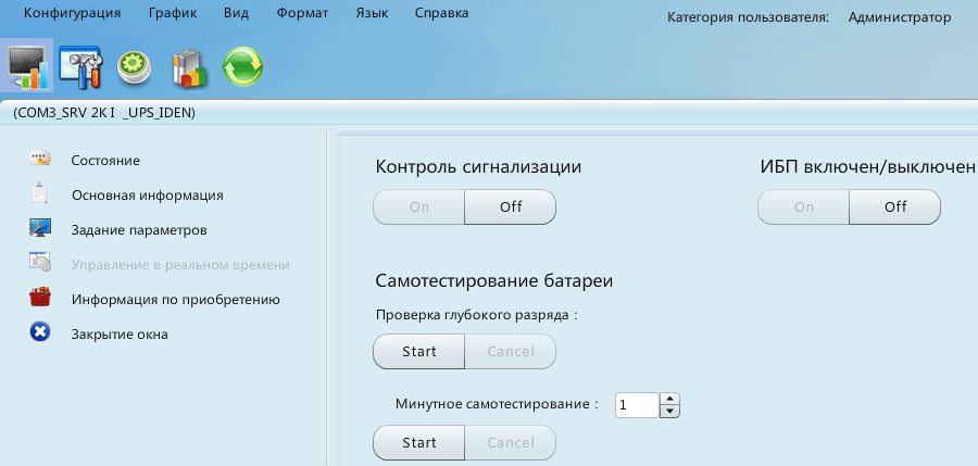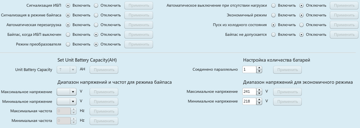 Очевидно, отображаемые настройки являются общими для ИБП из разных серий, поэтому для конкретной модели какие-то из них могут и не работать. С некоторыми из установок не все понятно: как мы уже отмечали, с панели управления отключить звуковую сигнализацию заблаговременно нельзя, можно лишь «погасить» звуковые сигналы, когда они уже зазвучали; можно ожидать того же и при управлении из программы, и действительно: попытка отключить отсутствующие сигналы не удается — выдается сообщение об ошибке, но когда сигналы уже звучат, команда на их отключение вроде бы проходит нормально, однако через некоторое время звуки возобновляются.