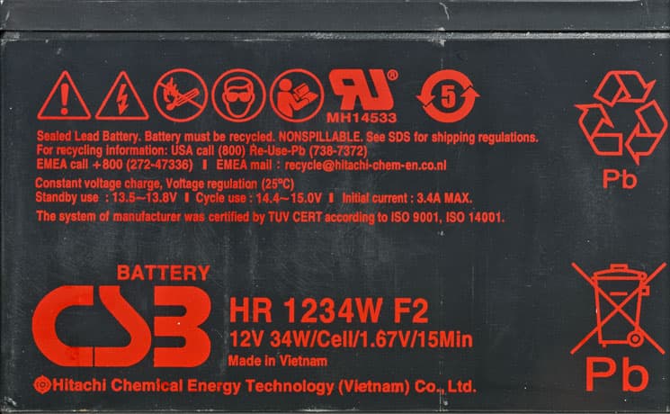 В нашем экземпляре ИБП использовались АКБ CSB HR 1234W F2. Значения «9 Ah» нет ни на их корпусе, ни в соответствующем datasheet, поэтому вновь напомним, что подобное обозначение чаще всего играет роль типоразмера, определяющего габариты батареи и нужного при подборе замены. А емкость не есть величина однозначная, она сильно зависит от условий разряда, прежде всего от тока нагрузки.