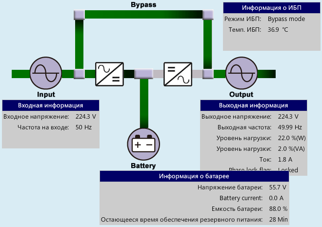 Информацию о состоянии ИБП и происходящих процессах можно наглядно отобразить в виде схемы потоков мощности: