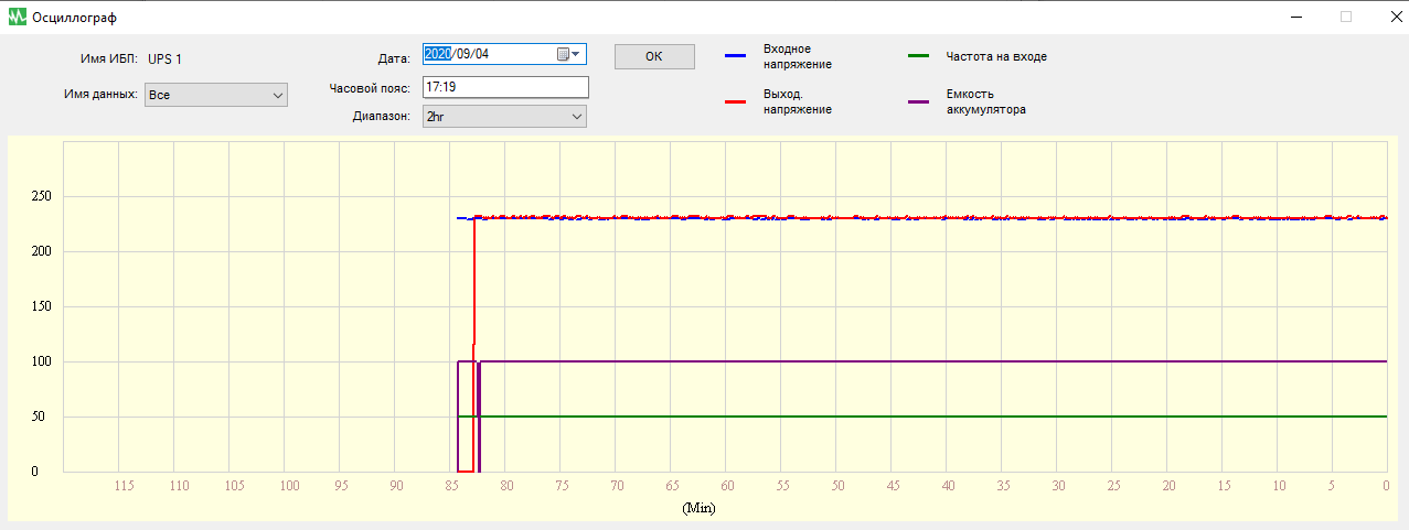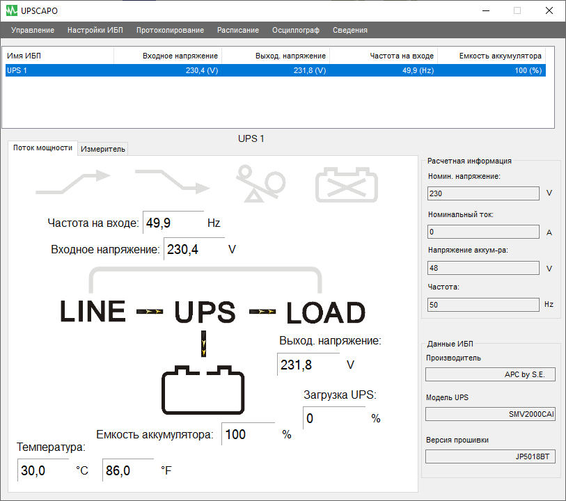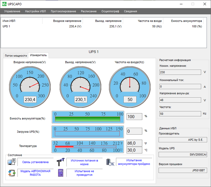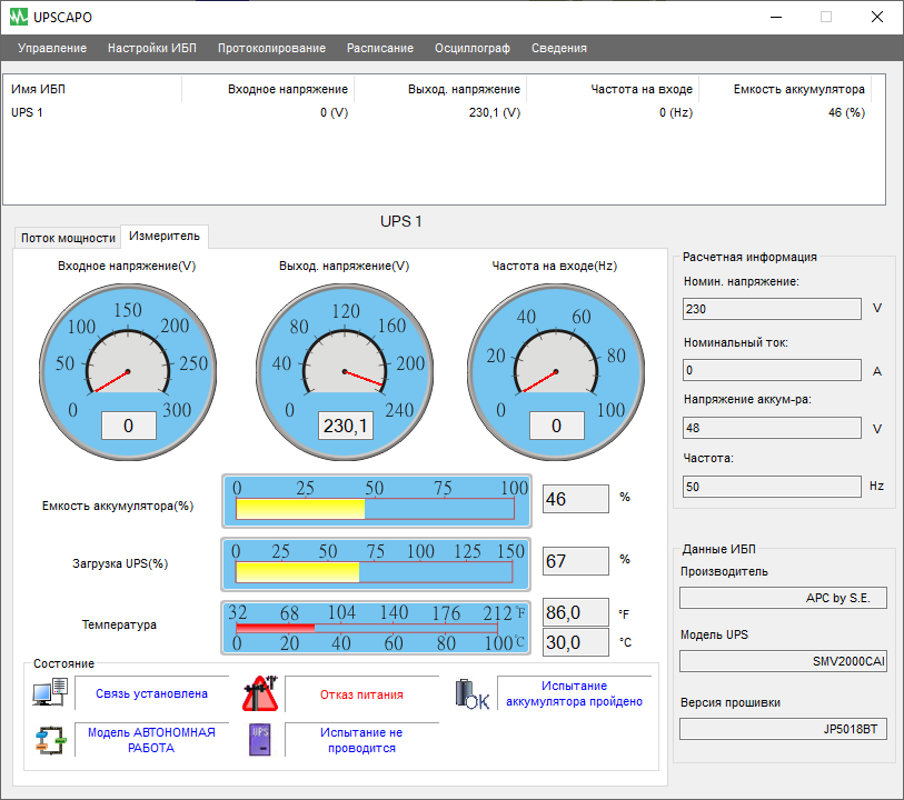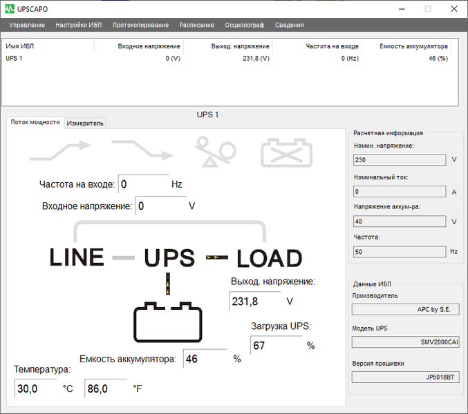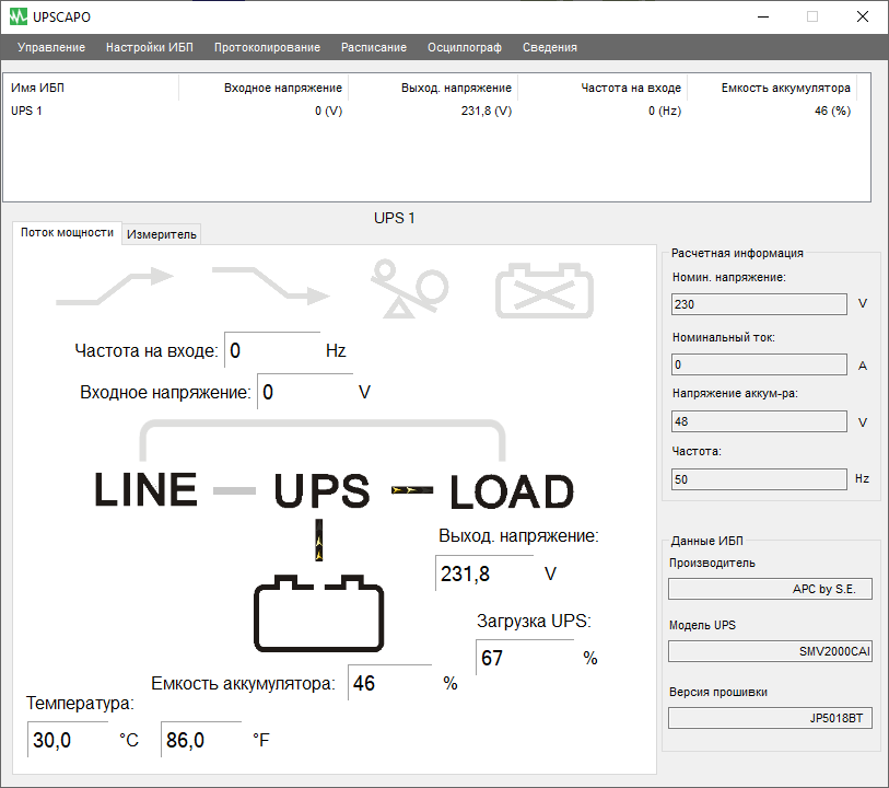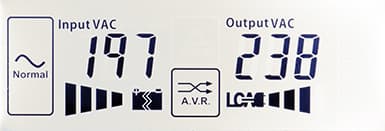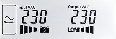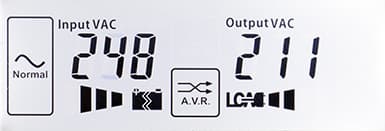 - цифровые значения: при работе от сети — для входного и выходного напряжений, в автономном режиме — для напряжений на батарее (постоянного) и на выходе (переменного),