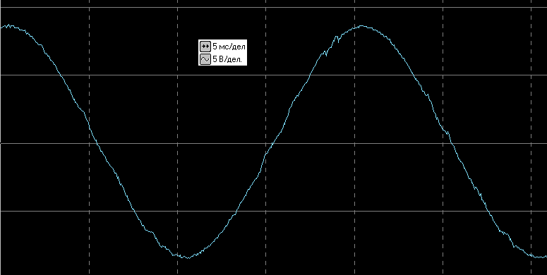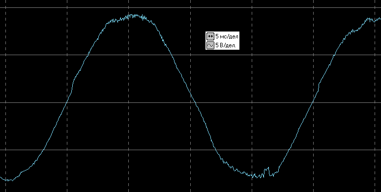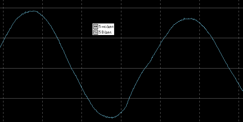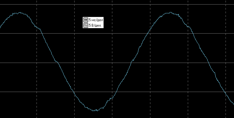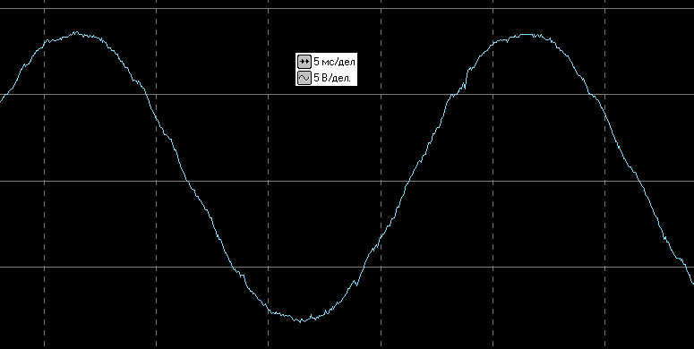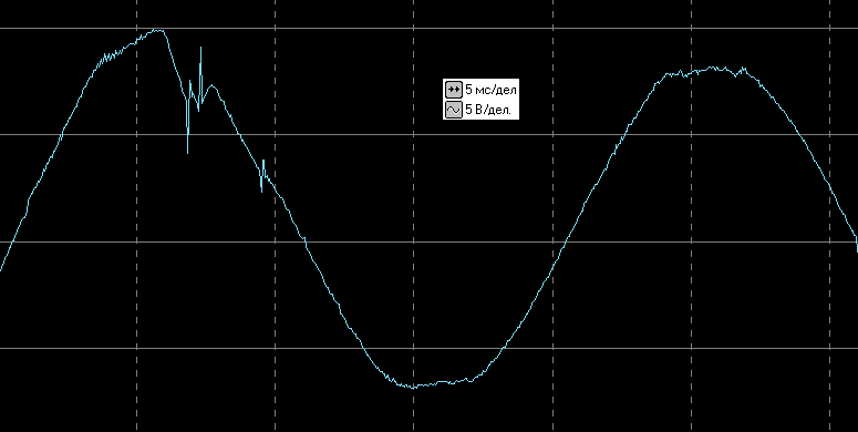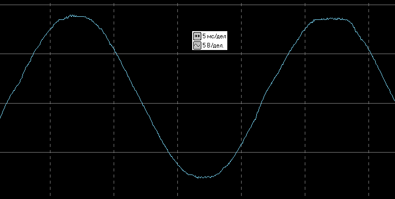 Вот осциллограмма выходного напряжения в автономном режиме без нагрузки (здесь и далее цена деления по горизонтали 5 мс, по вертикали 200 В — задействован внешний делитель 1:40):