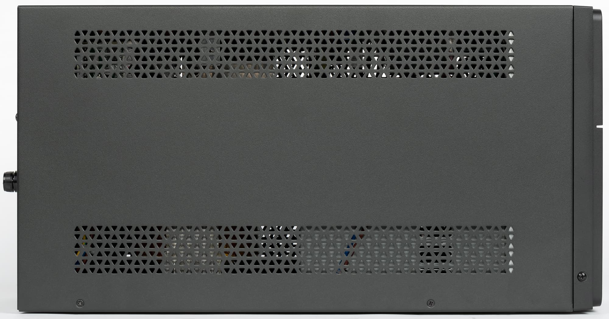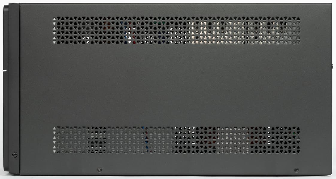 По бокам имеются ряды вентиляционных отверстий, днище сплошное. Ножки есть — небольшие округлые штампованные выступы без каких-либо амортизирующих наклеек; беда даже не в отсутствии амортизации, поскольку существенных вибраций и нет, а в другом: аппарат тяжелый, приподнять его трудно, зато поцарапать металлическими ножками поверхность, на которой установлен ИБП, очень легко.