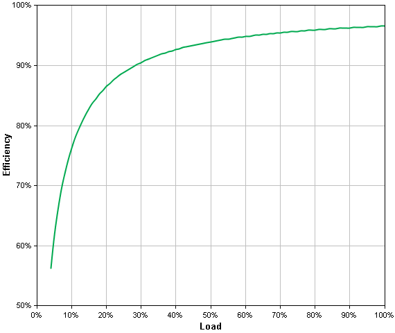 Нагрузка 100% — это 1400 Вт, для нее, по данным производителя, КПД составляет вполне приличные 96,6%. Но для устройств с потреблением 55-70 Вт (т. е. 4-5 процентов от максимума) КПД источника снизится до 55-60 процентов, а для меньших нагрузок график и вовсе не дает сведений, по форме кривой можно ожидать еще большего снижения, то есть рассчитывать для них на рекордно долгую работу в батарейном режиме не приходится.