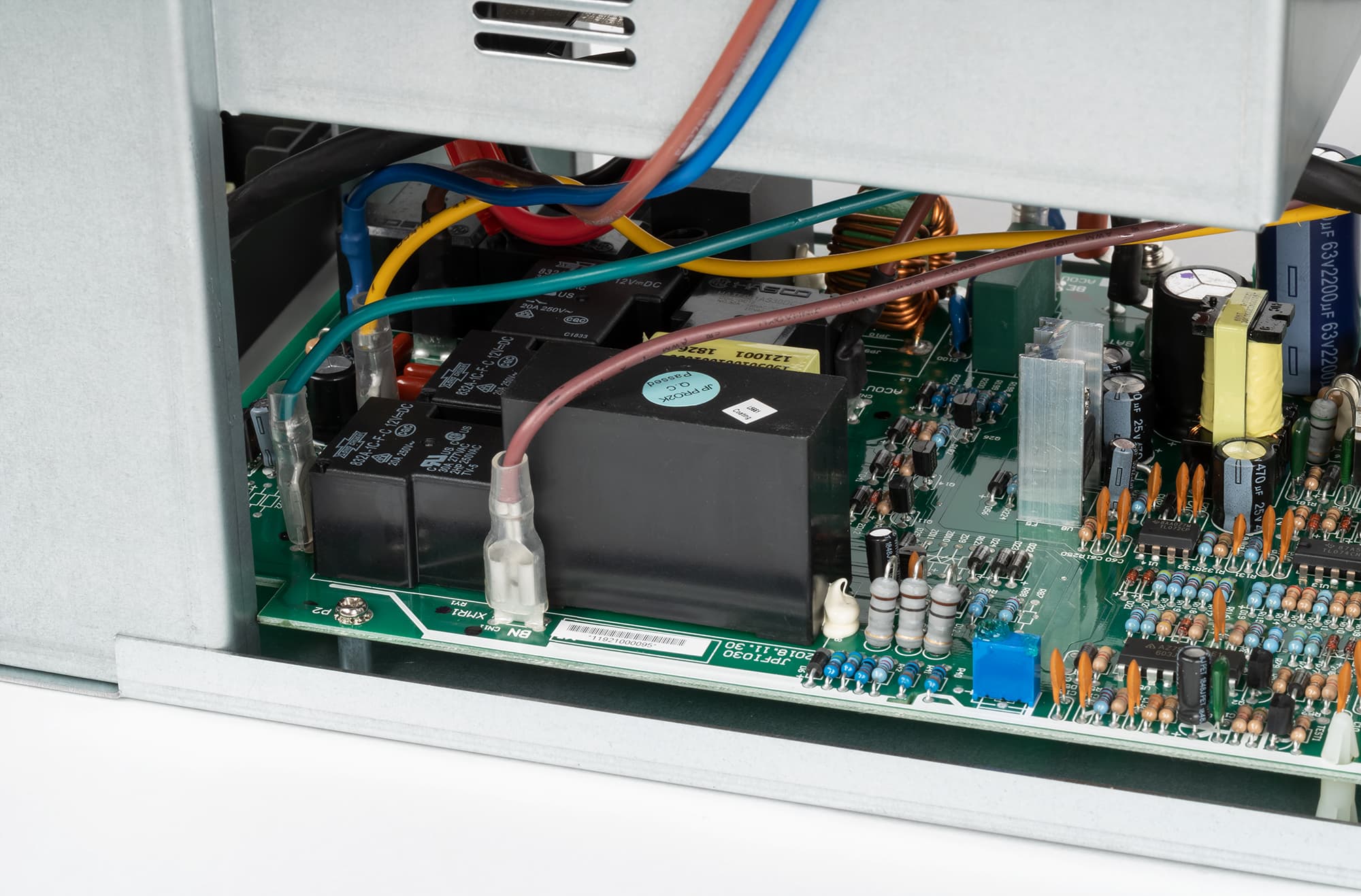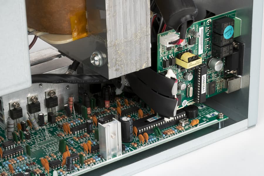 Еще одна небольшая плата прикреплена к задней стенке. На ней расположены схемы управления интерфейсами USB, RS232, компоненты для «сухих» контактов и SmartSlot.