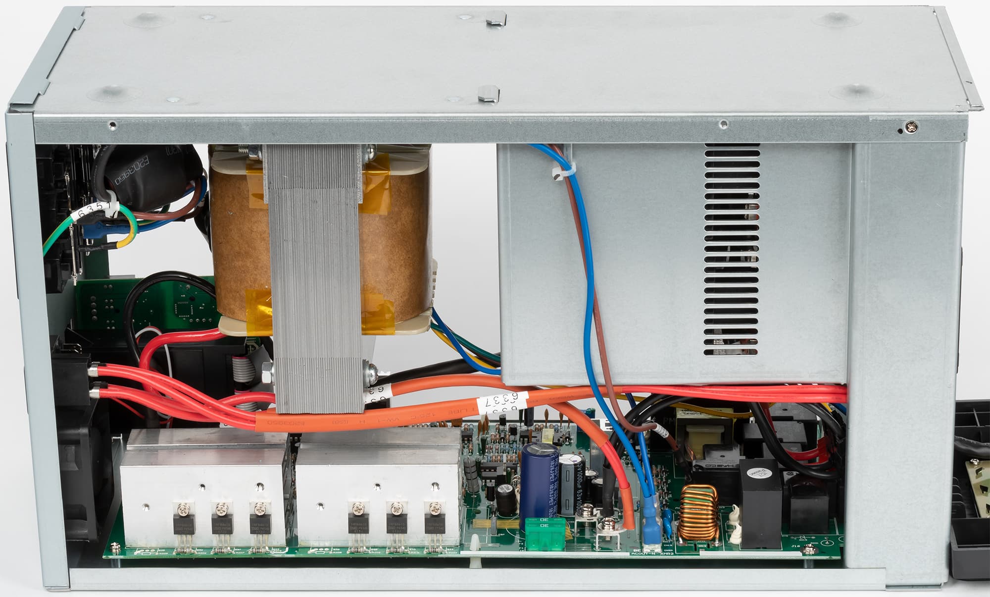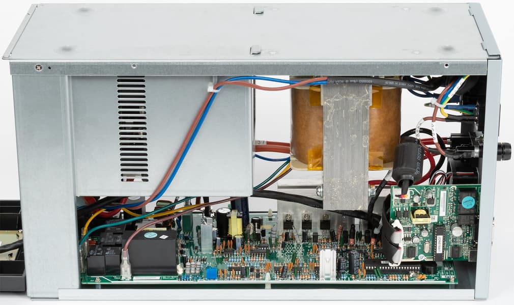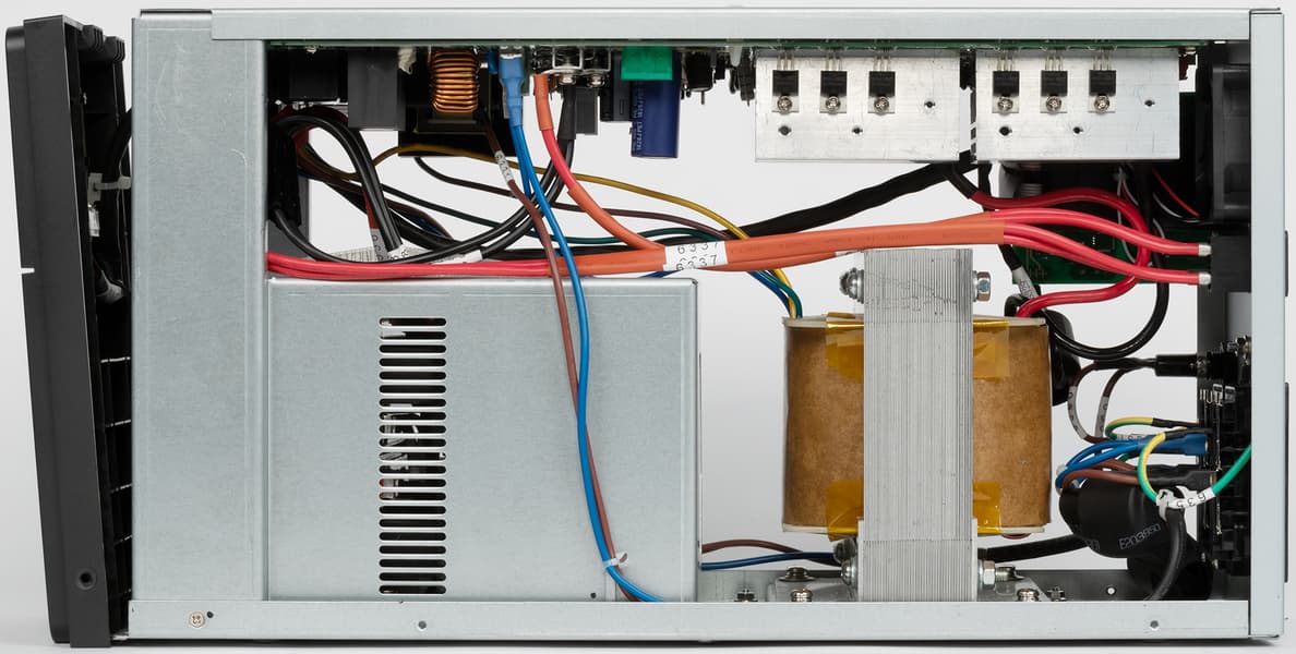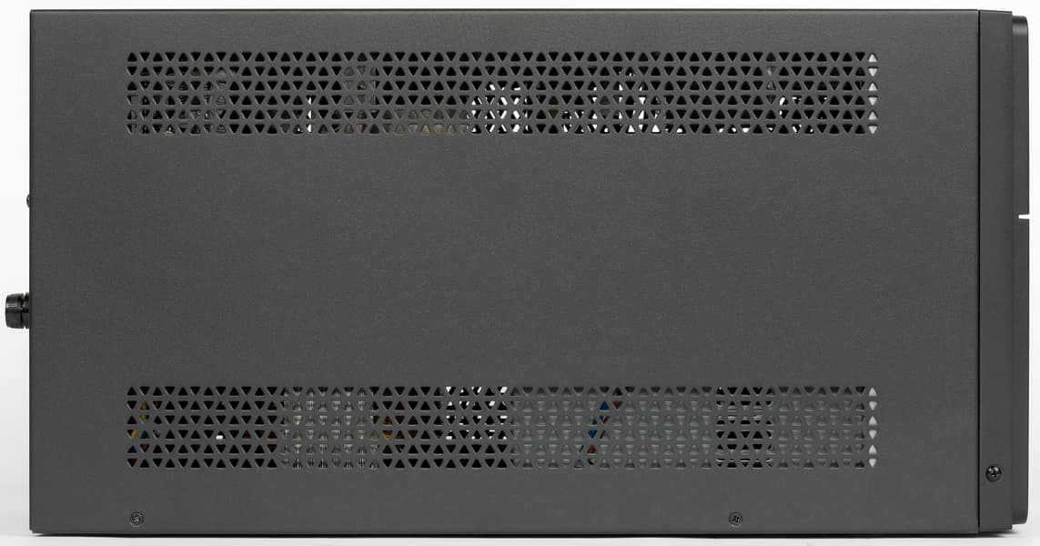 Трансформатор гудит всегда (если, конечно, источник подключен к розетке) — басовито, но тихо, и в нормальных условиях, когда не работает вентилятор, этот звук трудно услышать даже с расстояния в полметра. Если же, например, происходит переключение на понижающую или повышающую ступень, гудение немного меняет тональность и становится громче, но при этом начинает работать и вентилятор; естественно, в предыдущем абзаце приведены значения для общего уровня.