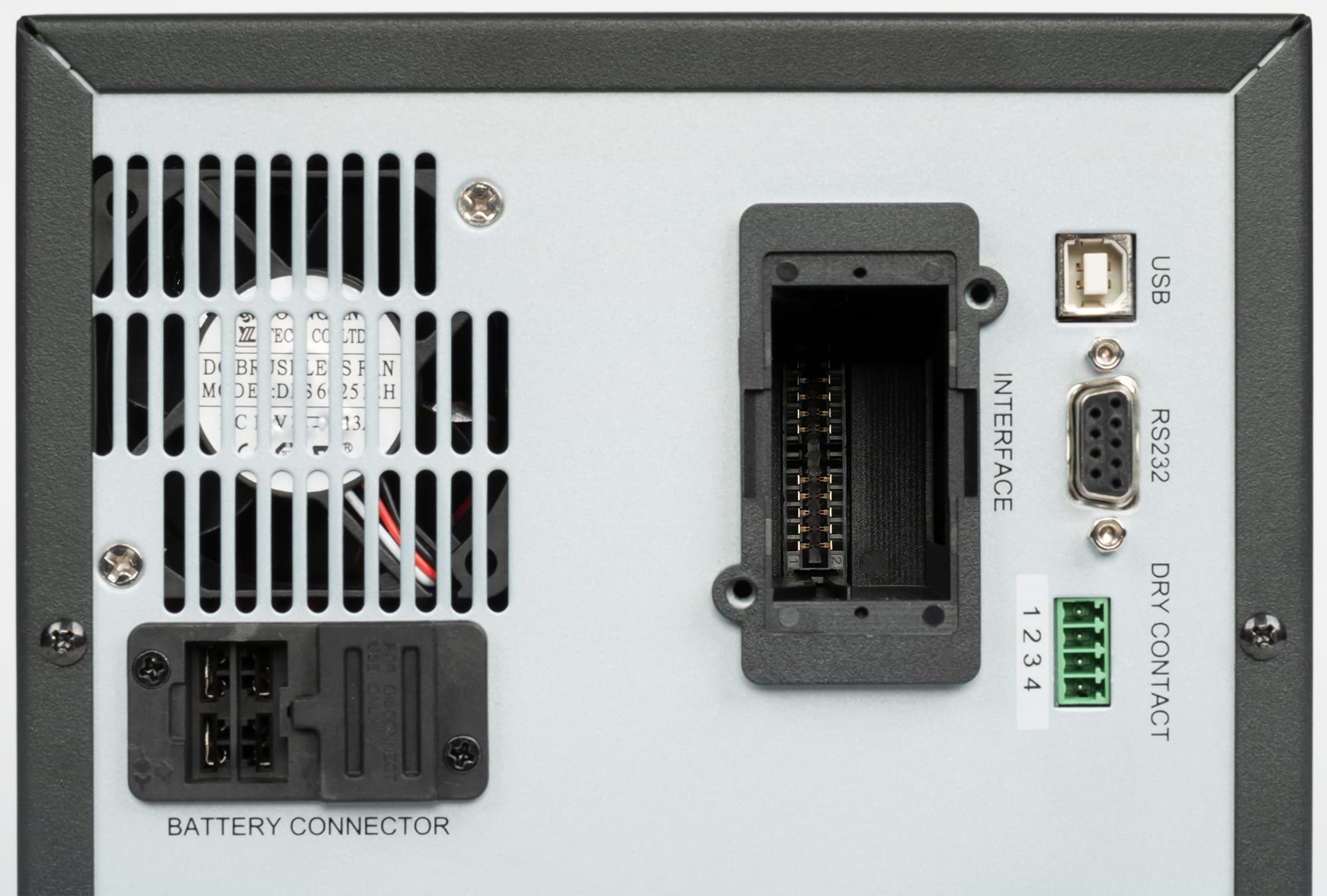 Правее решетки имеются закрытое крышечкой гнездо SmartSlot для подключения дополнительных модулей, расширяющих возможности использования, управления и мониторинга ИБП, а также интерфейсные разъемы USB-B и RS232, используемые для подключения к компьютеру, и набор «сухих» контактов.
