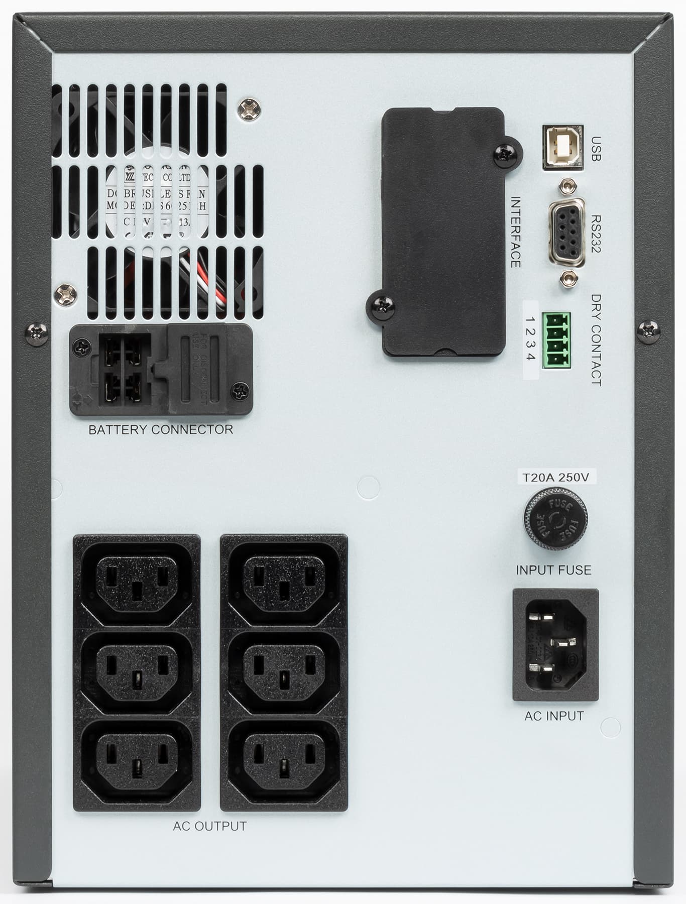 Нижнюю часть задней стенки занимают разъемы питания: входной С14 и шесть выходных C13 (IEC60320). Все выходные гнезда обеспечивают подключенные нагрузки защитой от импульсных помех и питанием от батареи (через инвертор).
