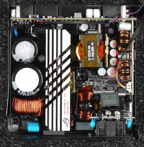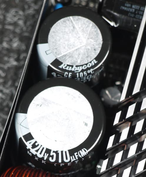Конденсаторы в блоке питания имеют японское происхождение, в основной массе это продукция под торговой маркой Rubycon. Установлено и большое количество полимерных конденсаторов. Подобная комбинация обычно соответствует устройствам высокого уровня.