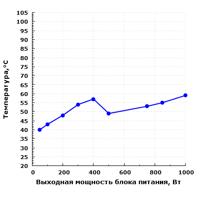 Мы изучили функционирование блока питания в единственном доступном — гибридном режиме работы системы охлаждения. В результате было установлено, что вентилятор в блоке питания включается как при достижении пороговой температуры на термодатчике (около 57 °C), так и при достижении выходной мощности около 460 Вт. Отключение вентилятора происходит только при снижении температуры на термодатчике до определенного порога (около 39 °C). Настройку систему управления вентилятором можно считать вполне адекватной.