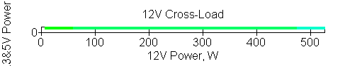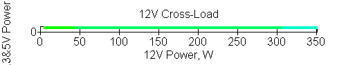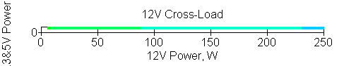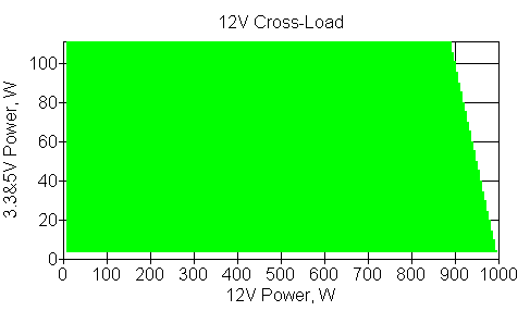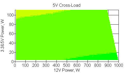 Следующим этапом инструментального тестирования является построение кросснагрузочной характеристики (КНХ) и представление ее на четвертьплоскости, ограниченной максимальной мощностью по шине 3,3&5 В с одной стороны (по оси ординат) и максимальной мощностью по шине 12 В с другой (по оси абсцисс). В каждой точке измеренное значение напряжения обозначается цветовым маркером в зависимости от отклонения от номинального значения.