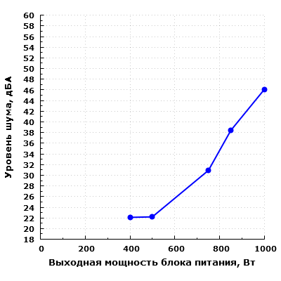 При работе с постоянно вращающимся вентилятором шум блока питания в диапазоне мощности до 500 Вт включительно находится на уровне около 23 дБА с расстояния 0,35 метра. Подобный уровень шума можно считать минимально заметным.