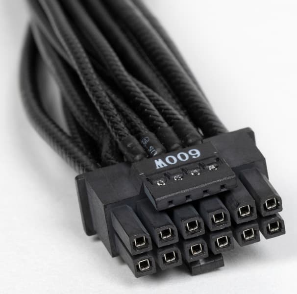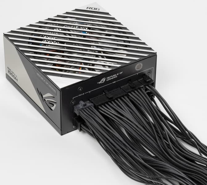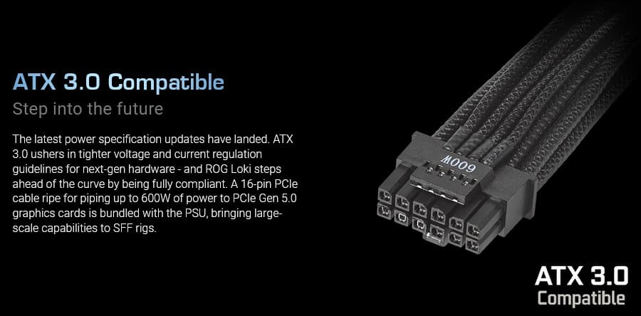 Еще одной пока очень редкой и интересной особенностью данного блока питания является соответствие стандарту ATX 3.0, то есть он предлагает штатную возможность подключать видеокарты с новыми разъемами питания PCIe 5.0 без использования переходников. Один из съемных комплектных шнуров питания имеет 16-контактный разъем PCIe 5.0, 12 контактов в котором являются силовыми, а 4 — сигнальными. Прямо скажем, не в каждом компактном корпусе (для которых обычно предназначены БП типоразмера SFX-L) востребовано использование топовых графических ускорителей с потреблением до 600 Вт, но прекрасно, что Asus предлагает подобное решение для тех, кому это все-таки нужно.