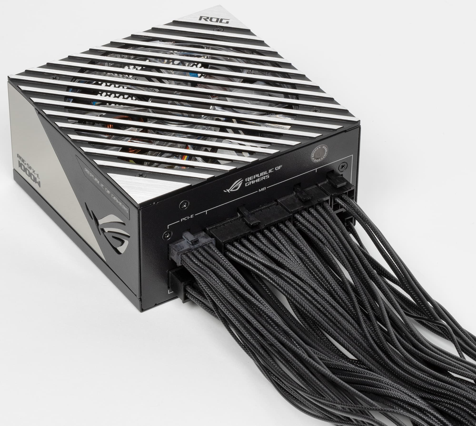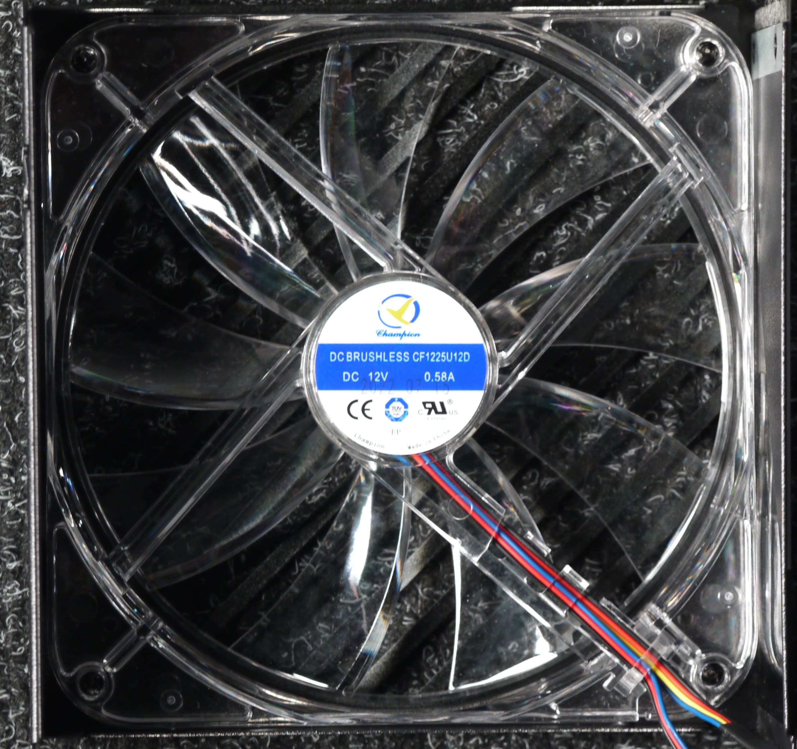 В блоке питания установлен вентилятор Champion CF122512D типоразмера 120 мм с 6-проводным подключением: 4 контакта — питание и ШИМ-управление частотой вращения, еще 2 контакта — подсветка. Вентилятор подключается к двум разъемам, шнур от одного из которых выходит к розетке системы подсветки. Вентилятор основан на гидродинамическом подшипнике, что подразумевает долгий срок его службы.