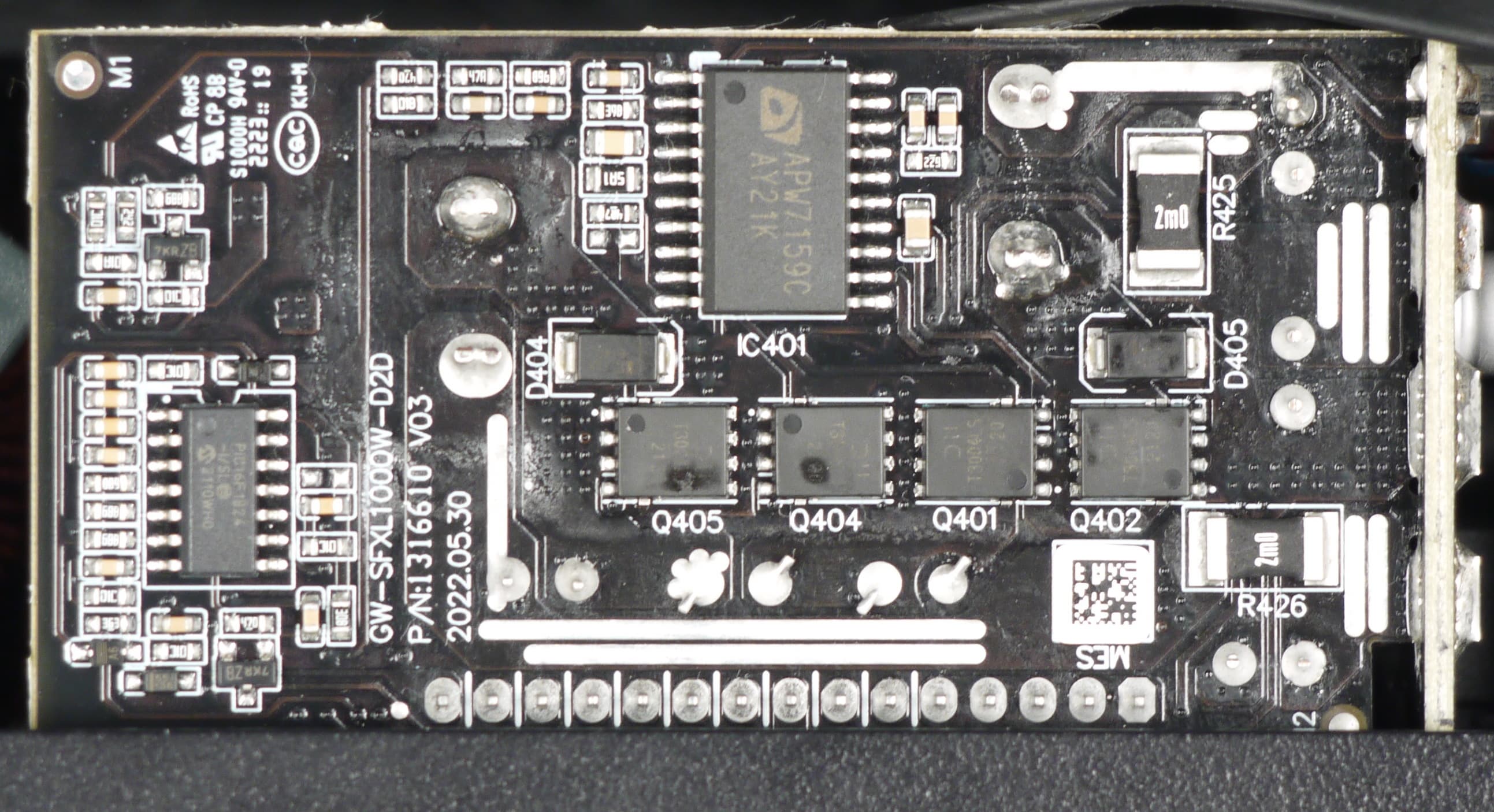Конструкция блока питания вполне соответствует современным тенденциям: активный корректор коэффициента мощности, синхронный выпрямитель для канала +12VDC, независимые импульсные преобразователи постоянного тока для линий +3.3VDC и +5VDC.