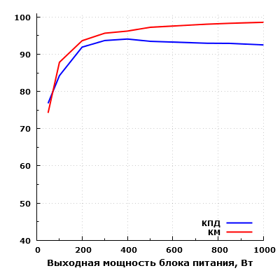 Всего таким образом мы измерили параметры блока питания в 9 точках. В результате максимальный КПД в нашем случае составил 94,1% при выходной мощности 400 Вт, при более высокой нагрузке КПД остается уверенно выше 90%. Максимальная рассеиваемая мощность составила 81 Вт при выходной мощности 1000 Вт, что относительно немного для блока питания подобной мощности.